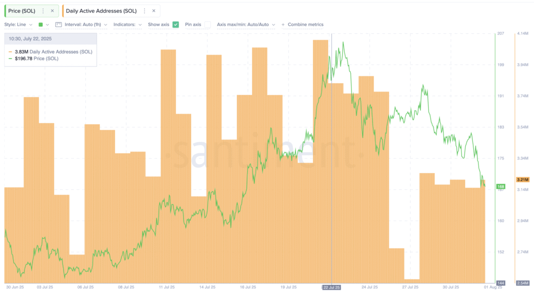 Daily active addresses on Solana peaked at 4.1 million on July 21, followed by the SOL price surging past $200. This signalled that a strong network activity backed the rally.