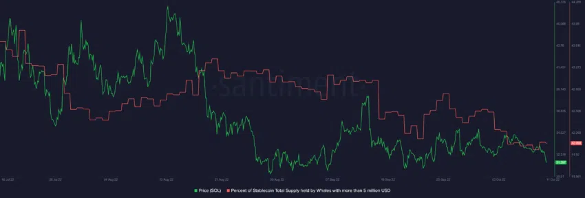Despite the larger bearish narrative and price blues, whales and larger entities showing a healthy accumulation often plays in favor of altcoins. For Solana, however, the Stablecoin Total Supply held by Whales with more than 5 million USD has been on a long-term downward trend. Because of this, there are fewer whales with pockets deep enough to spur large price moves.