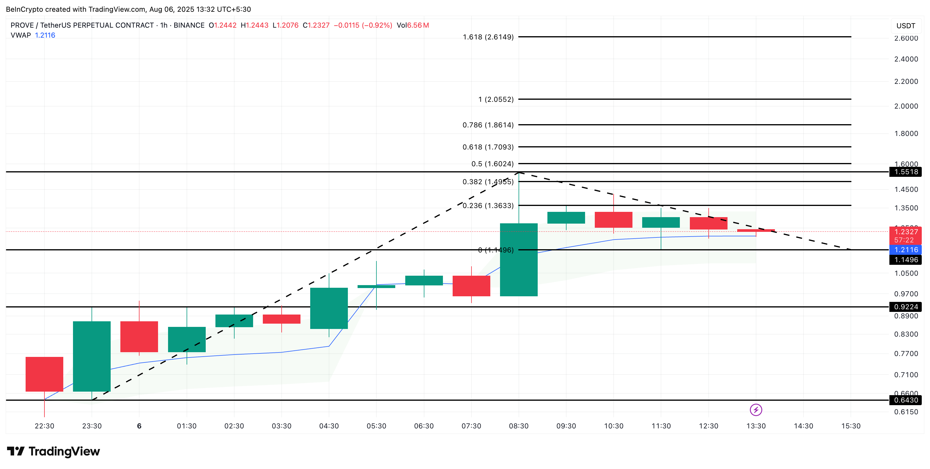 The 1-hour chart paints a classic retracement story. After peaking at almost $1.55, PROVE retraced cleanly toward the $1.14 level and is now hovering around $1.23. Importantly, this area also aligns with the anchored VWAP (Volume Weighted Average Price) line at $1.21, where price has respected support multiple times.