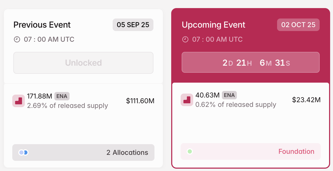 The team will release 40.63 million ENA tokens on October 2 via its cliff vesting schedule. The tokens, worth $23.42 million, account for 0.62% of the released supply.