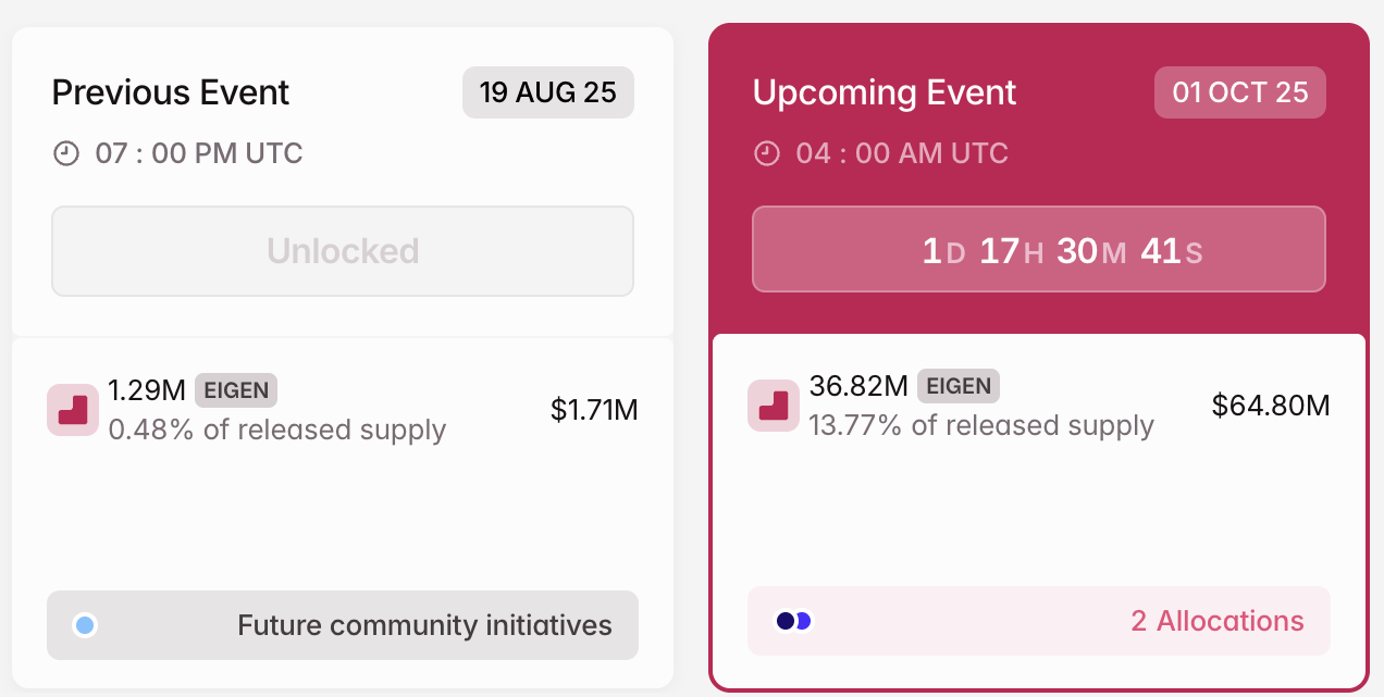 On October 1, the network will unlock 36.82 million EIGEN tokens, worth around $64.80 million. The unlocked tokens represent 13.77% of the released supply.