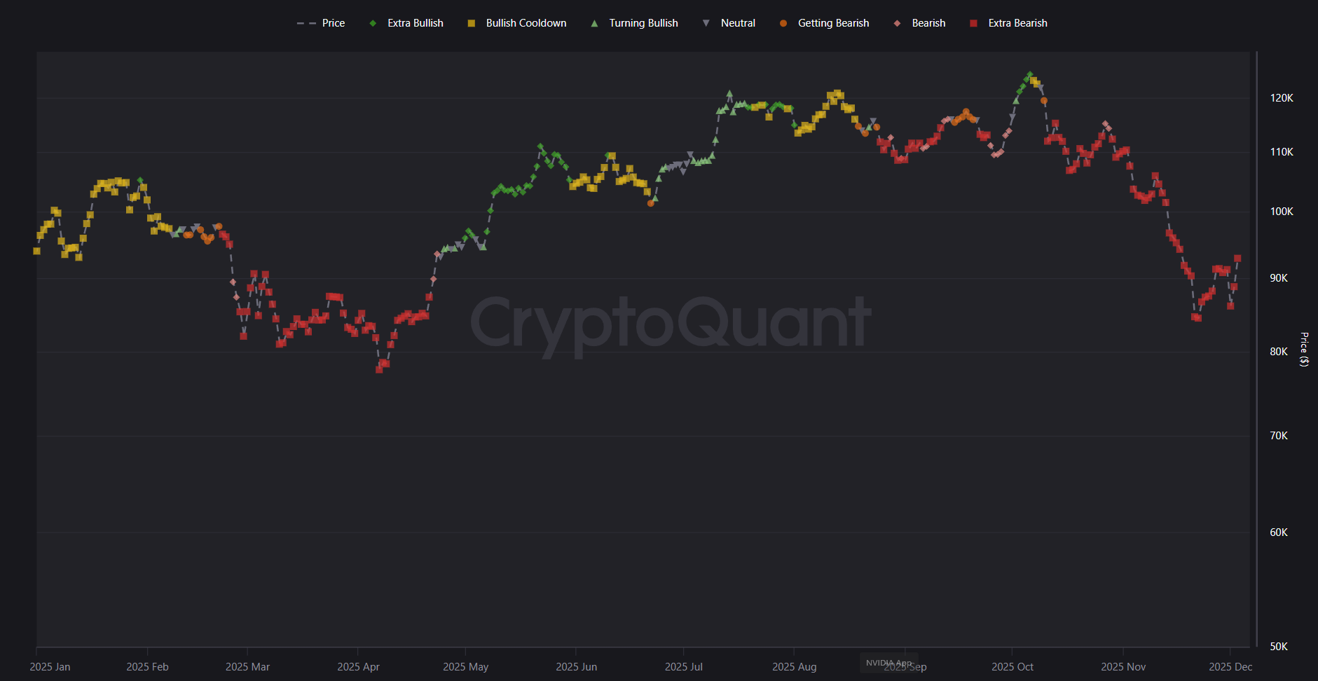 Even the recent recovery toward $92,000 is categorized as a bearish-zone rally, mirroring distribution phases seen in previous cycle tops.