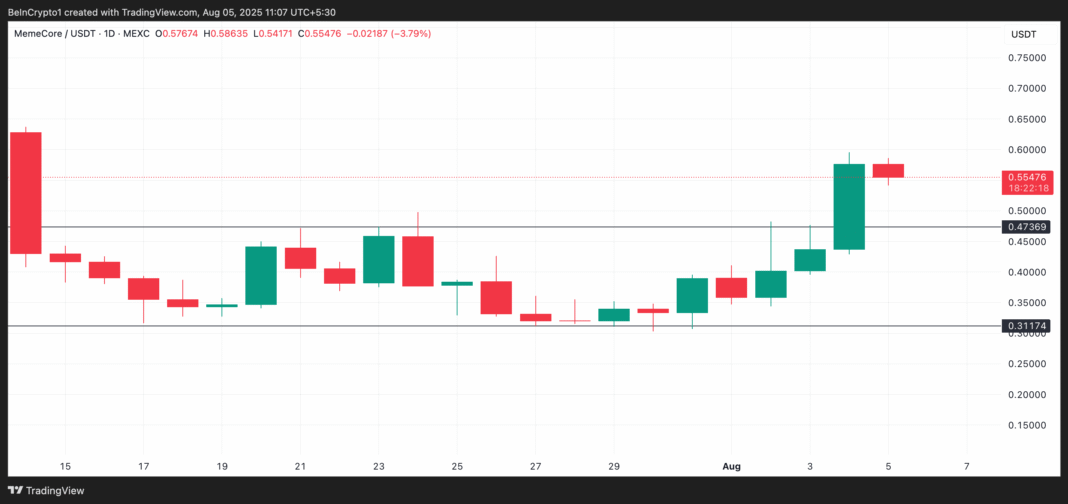 As of this writing, the key moving average forms dynamic support below the coin’s price at $0.40. For context, M currently trades at $0.55.