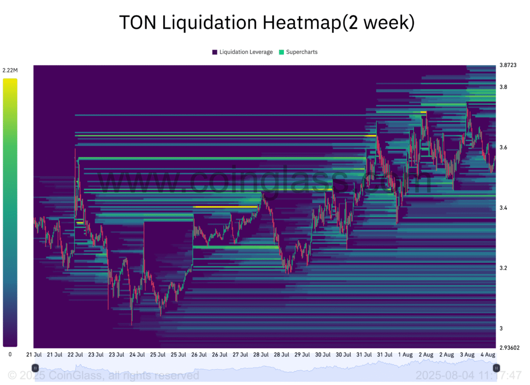 According to Coinglass, TON’s liquidation heatmap shows a sizable concentration of liquidity around the $3.77 price zone.
