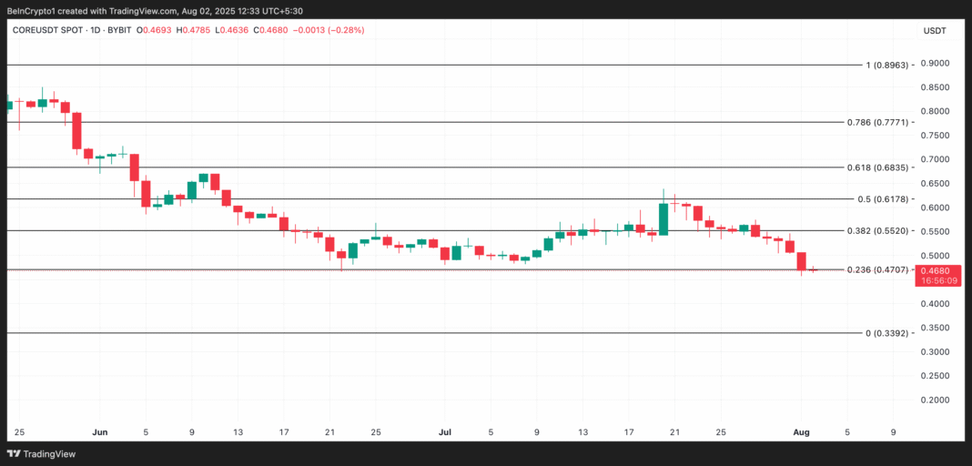 Readings from the CORE/USD one-day chart show the asset struggling below a key resistance level at $0.47. If selling pressure intensifies, CORE could fall lower and slide toward its next major support floor at $0.33.