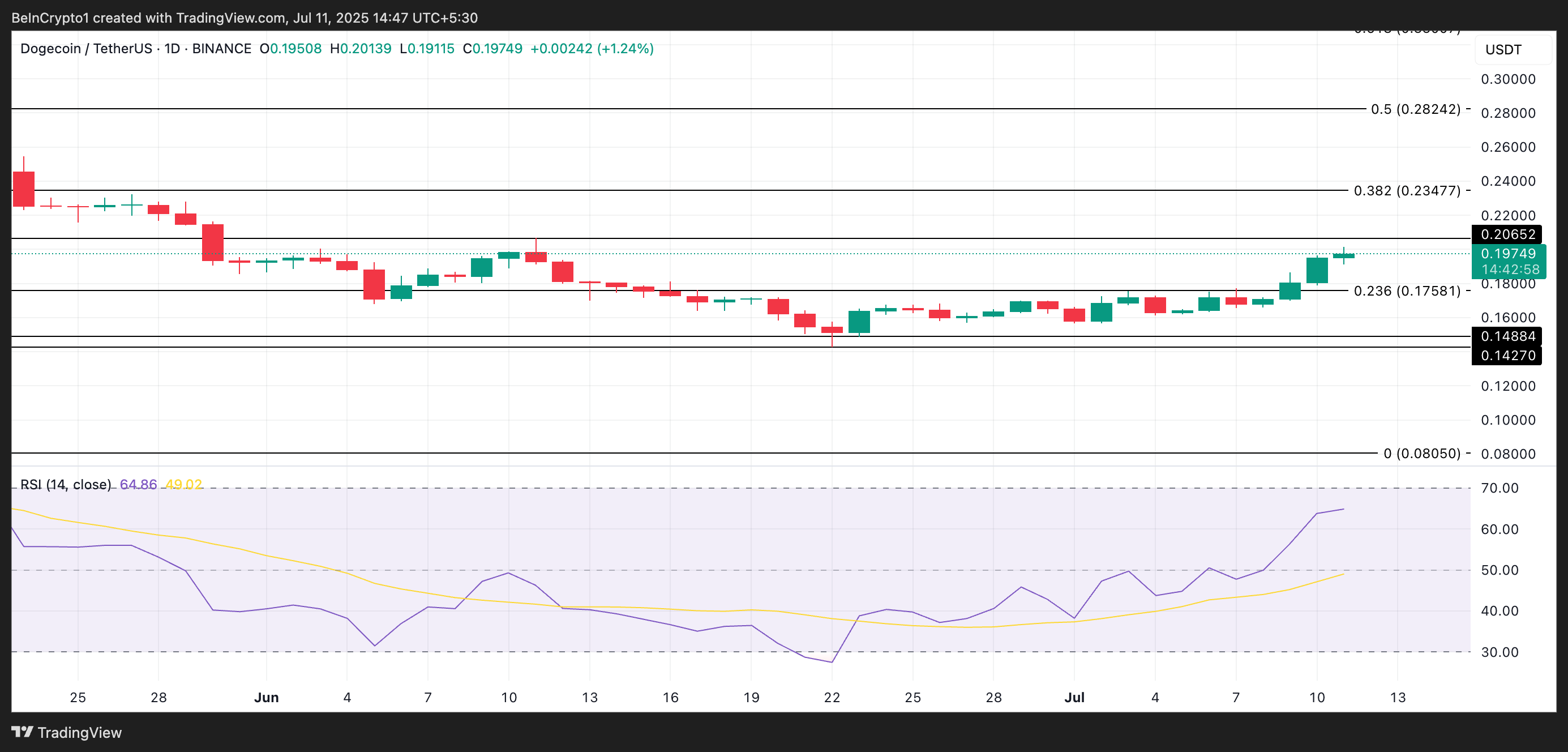 At press time, DOGE trades at $0.197, up 18% over the past week. On the daily chart, its Relative Strength Index (RSI) is 64.86 and climbing, indicating strong buy-side pressure.