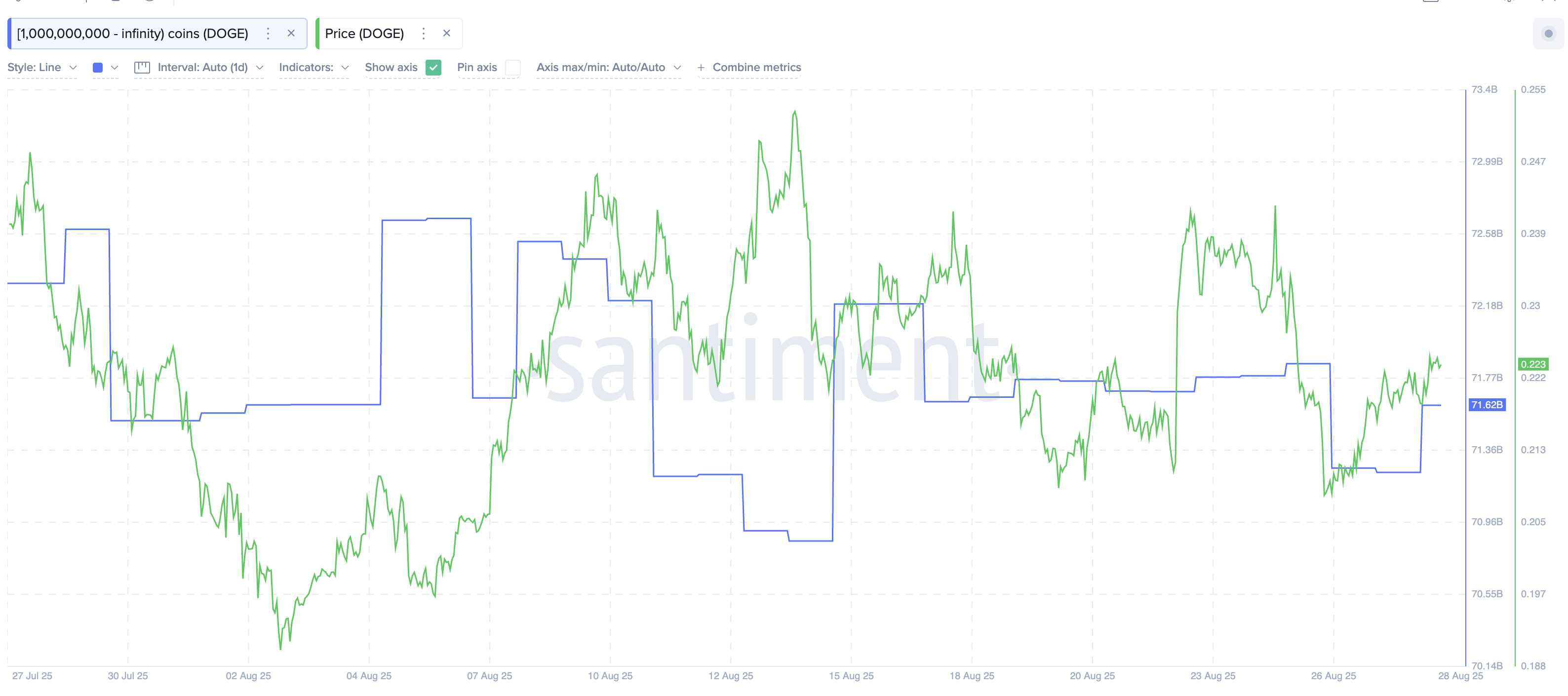 Large holders have taken note. Between August 27 and 28, mega wallets (1 billion DOGE or more) raised their balances from 71.24 billion to 71.62 billion DOGE — a 0.53% increase, worth around $84 million at $0.2230. This kind of accumulation makes DOGE one of the meme coins to watch in September.