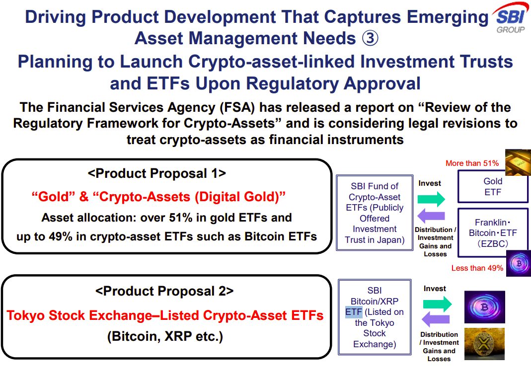 - SBI Holdings expects to launch Japan’s first crypto ETFs, focusing on XRP, Bitcoin, and a blended ‘Digital Gold’ ETF.
