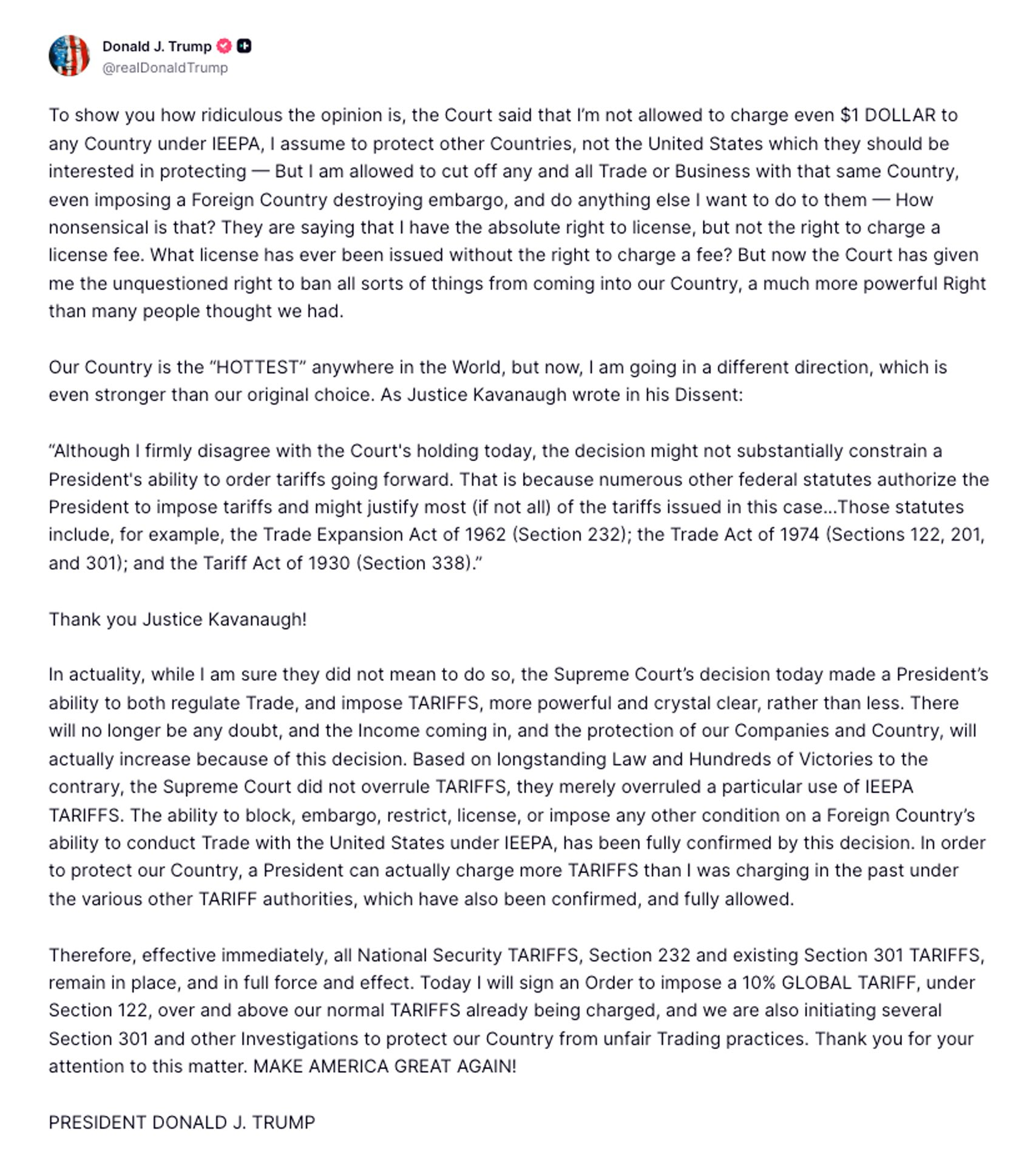 More importantly, Trump announced a new 10% global tariff under Section 122 of the Trade Act of 1974. This is a separate law that allows the president to impose temporary tariffs to address trade imbalances.