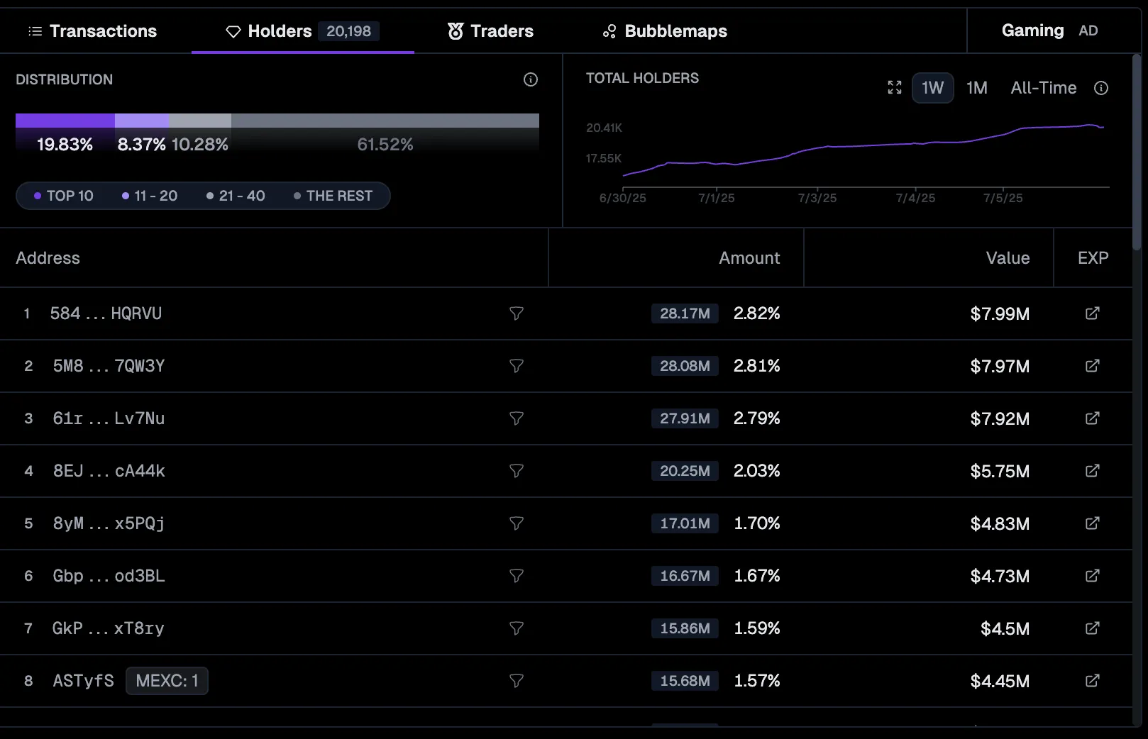 Looking at the holder concentration chart, nearly 20% of the total token supply is held by the top 10 wallets. The top address alone controls 2.82% ($7.99 million). This kind of token concentration is prone to aggressive sell-offs.