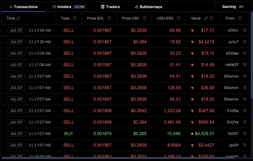At the time of writing, the live transaction feed is a bloodbath. Sell after sell is hitting the books, with only the rare green candle in between. A retail dump of 3,461 USELESS ($982.84) and another of 1,223 tokens ($347.60) both occurred just recently.