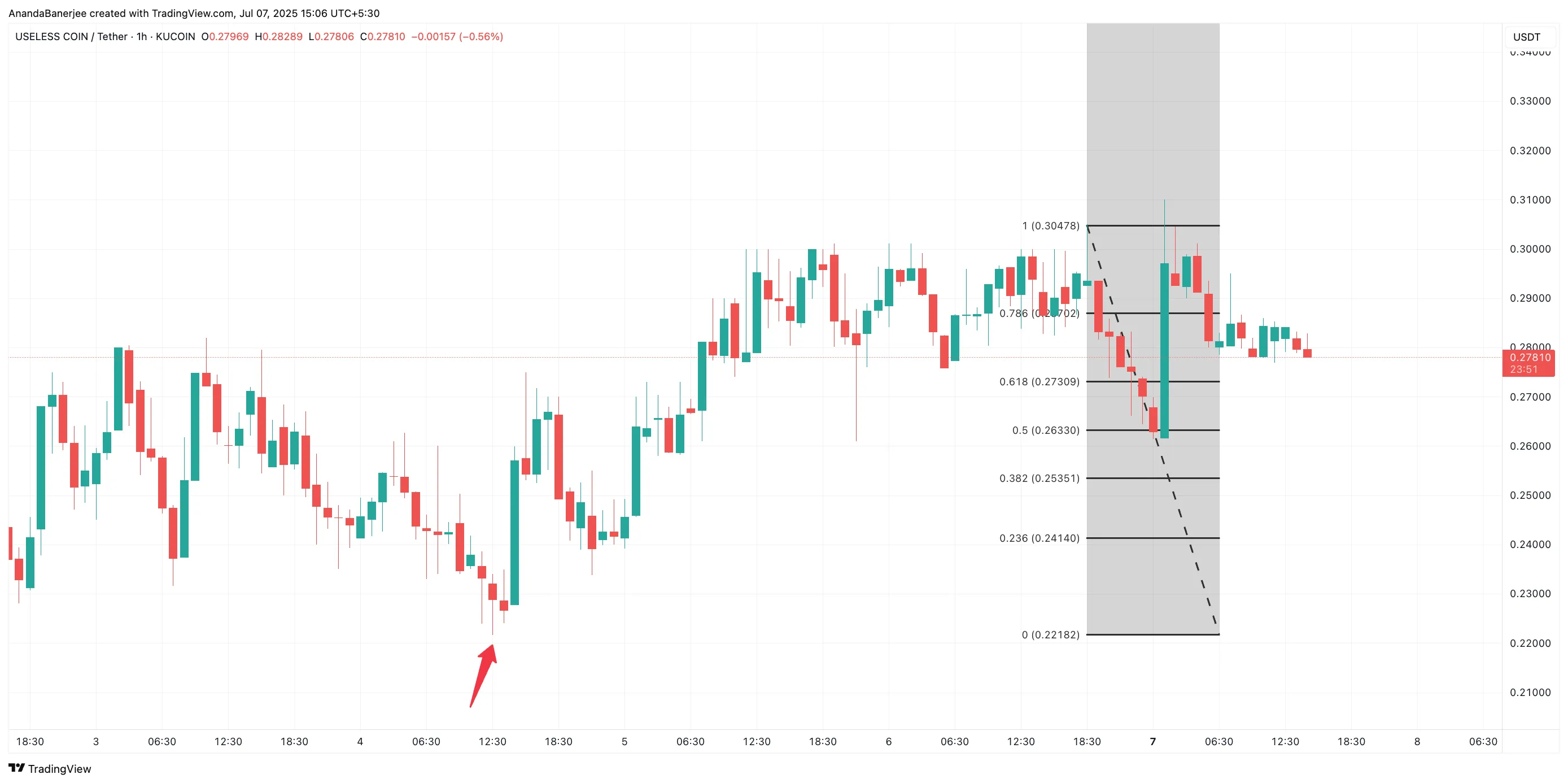 The Fibonacci retracement was drawn from $0.3047 (recent high) to $0.2218, which marked the lowest wick before the bounce began. This point was chosen because it was the last major drop before buyers stepped in; a clean local bottom that confirms the full extent of the move.