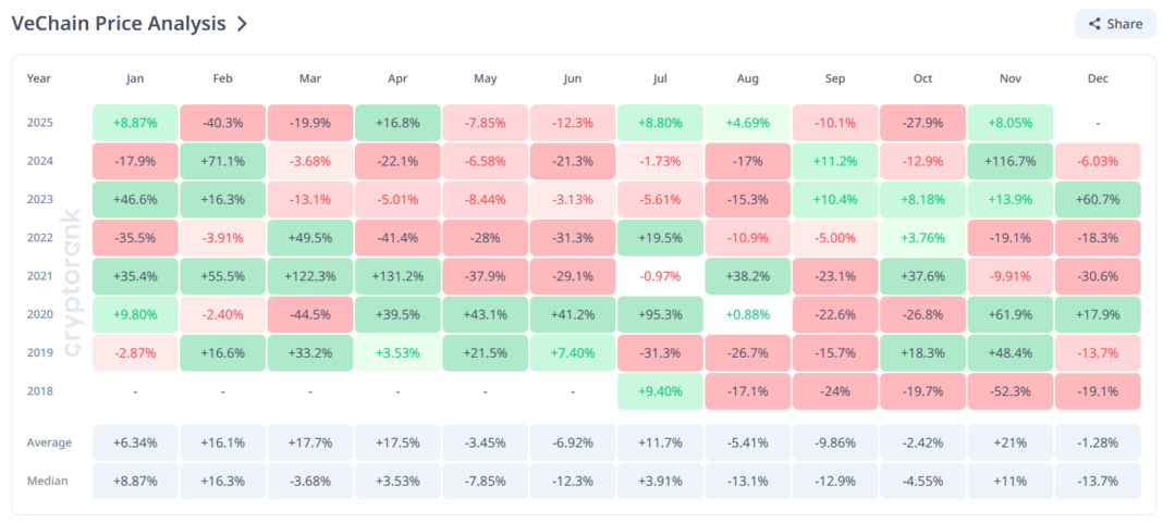VeChain’s price performance over the last seven years shows November has usually been its strongest month. The median return of 10.9% and the average return of 20.9% stand as the highest among all months. These gains often come after periods of muted activity, giving long-term holders reason to expect seasonal strength.