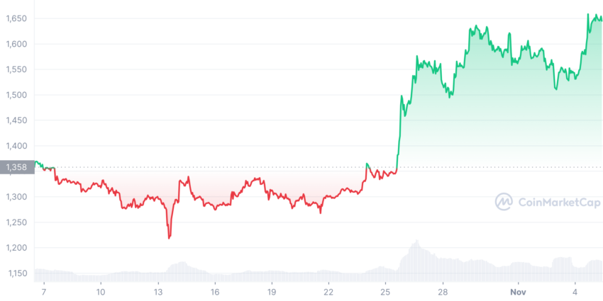 ETH has outperformed BTC’s price performance over the last 24 hours and on the 30-day metric. According to CoinMarketCap data, Ethereum rose 4.8% in the last 24 hours and by 22.3% in the last 30 days. It is now trading at $1,652 as of press time.