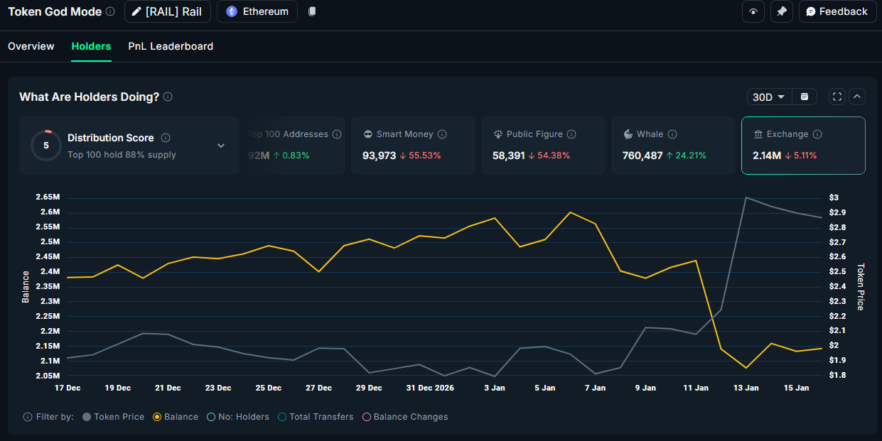 RAIL is the governance token of RAILGUN and currently has a market capitalization of over $165 million. Nansen data shows that over the past 30 days, RAIL balances on exchanges declined by more than 5%. At the same time, balances held by whale wallets increased by over 24%.
