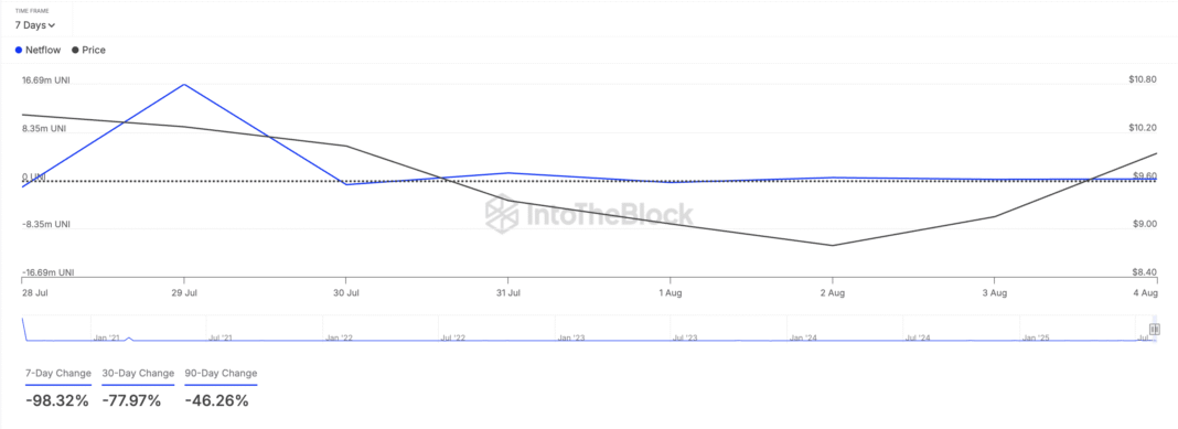 Decentralized finance (DeFi) token UNI is one of the assets that crypto whales appear to be distributing ahead of August 7. This is reflected by its large holders’ netflow, which has plunged 98% in the past seven days, per IntoTheBlock.