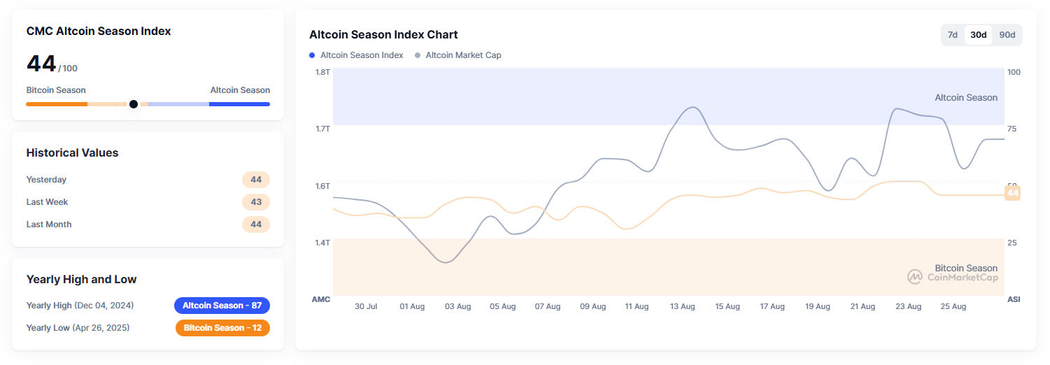 “The CMC Altcoin Season Index has also recovered but remains well below the key level of 75. Many mid- and small-cap alts are still lagging or trading sideways, showing no widespread altcoin outperformance,” said Péquignot.