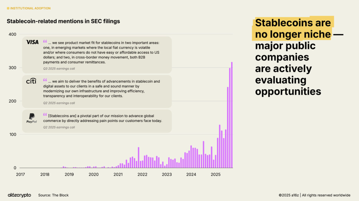 According to the a16z report, this transformation is being fueled by major institutions and stablecoin adoption. Circle’s market cap climbed past $50 billion after its IPO.