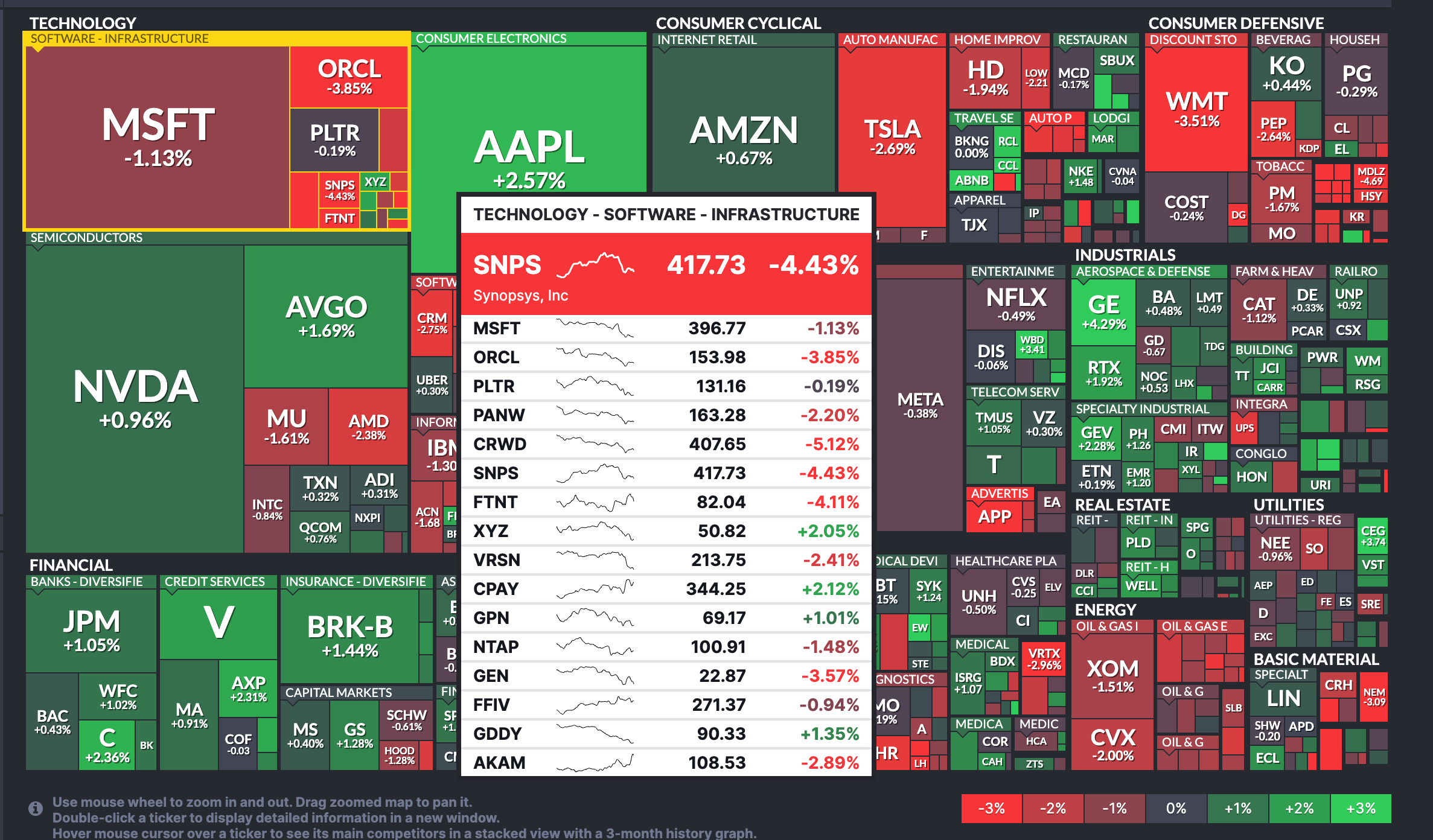 In the Technology Select Sector SPDR Fund (XLK), SNPS carries a modest weight of 0.72%. This limits its direct ETF impact but serves as a strong proxy for software weakness (e.g., ORCL -3.85%, CRWD -5.12%, FTNT -4.11%).