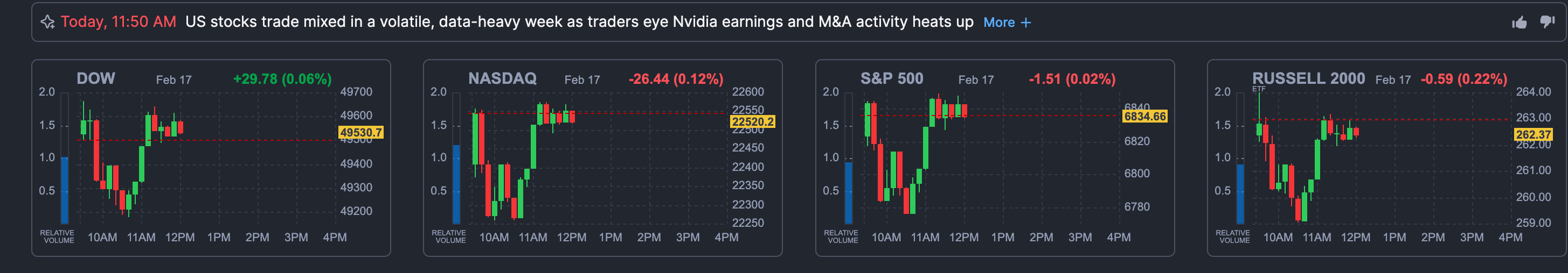 Wall Street remains cautious on February 17, 2026, with the US stock market trading mixed but overall subdued amid persistent SaaSpocalypse fears. The S&P 500 opened weaker, briefly dipping below its 100-day EMA before reclaiming it.