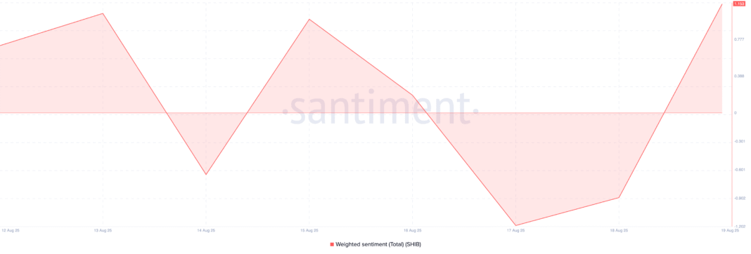 Despite its recent lackluster performance, SHIB has seen its weighted sentiment shift upward, showing that traders are growing increasingly optimistic about the meme coin. According to Santiment, this metric stands at a seven-day high of 1.153 at press time.