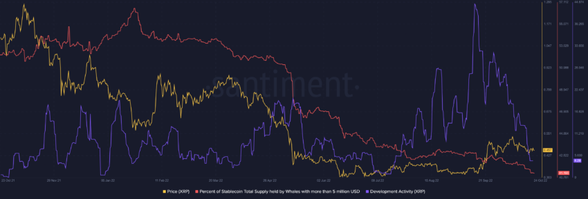 XRP development activity also trended lower and has made lower lows since Sept. 14, which was a bearish trend. The development activity is at its lowest levels since July.