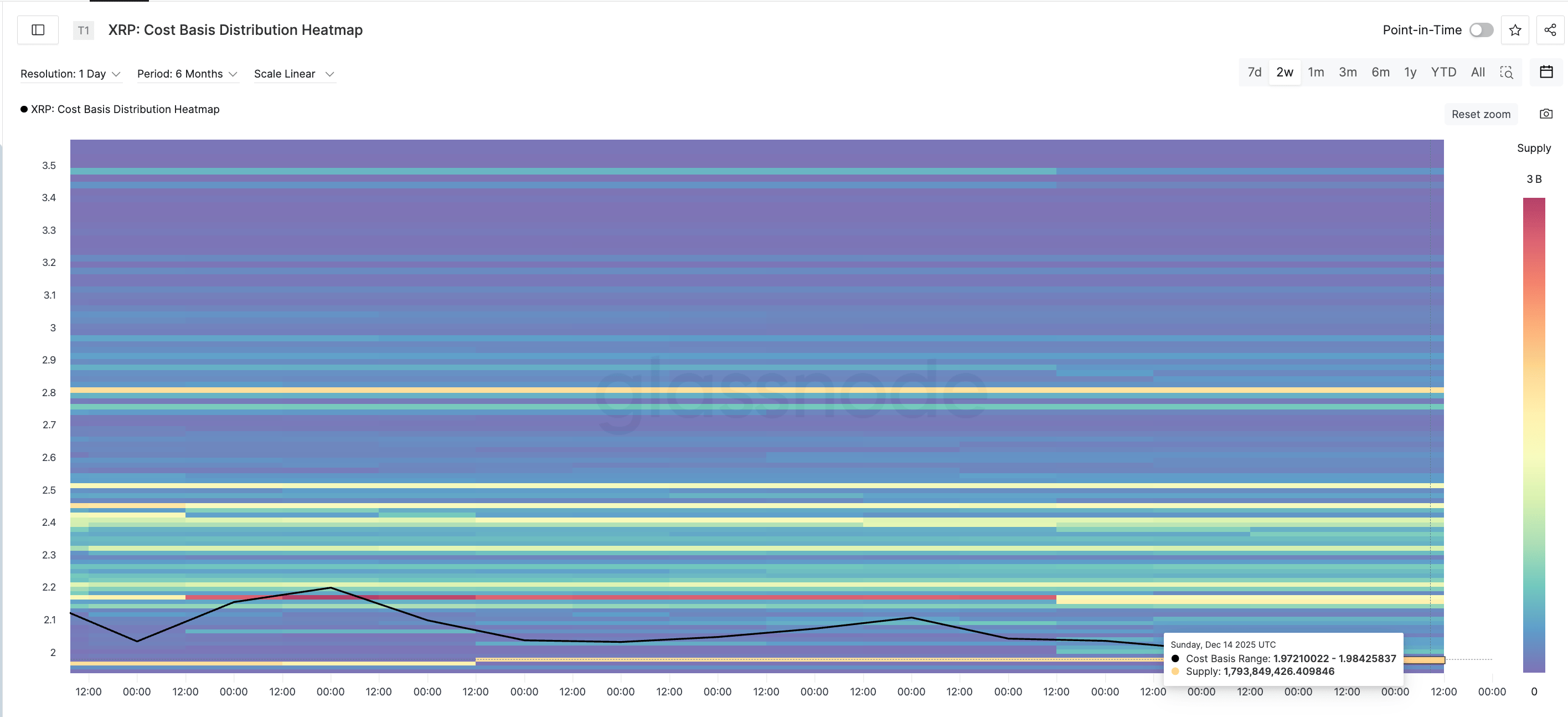 Around 1.79 billion XRP were accumulated in this range. A cost basis heatmap shows where large groups of holders bought their coins. When price trades near these levels, holders are less likely to sell at a loss, which strengthens support.
