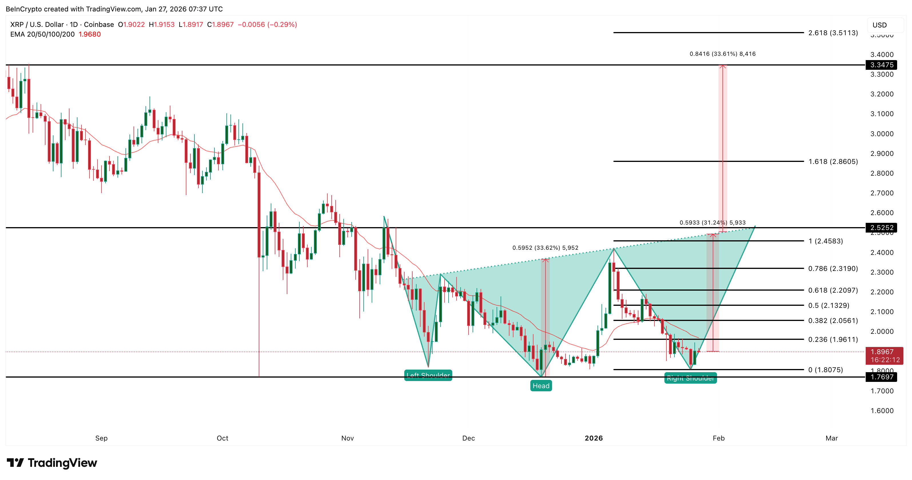 From here, XRP would need roughly a 31% move just to reach the neckline. If the breakout happens, the measured upside is around 33%.