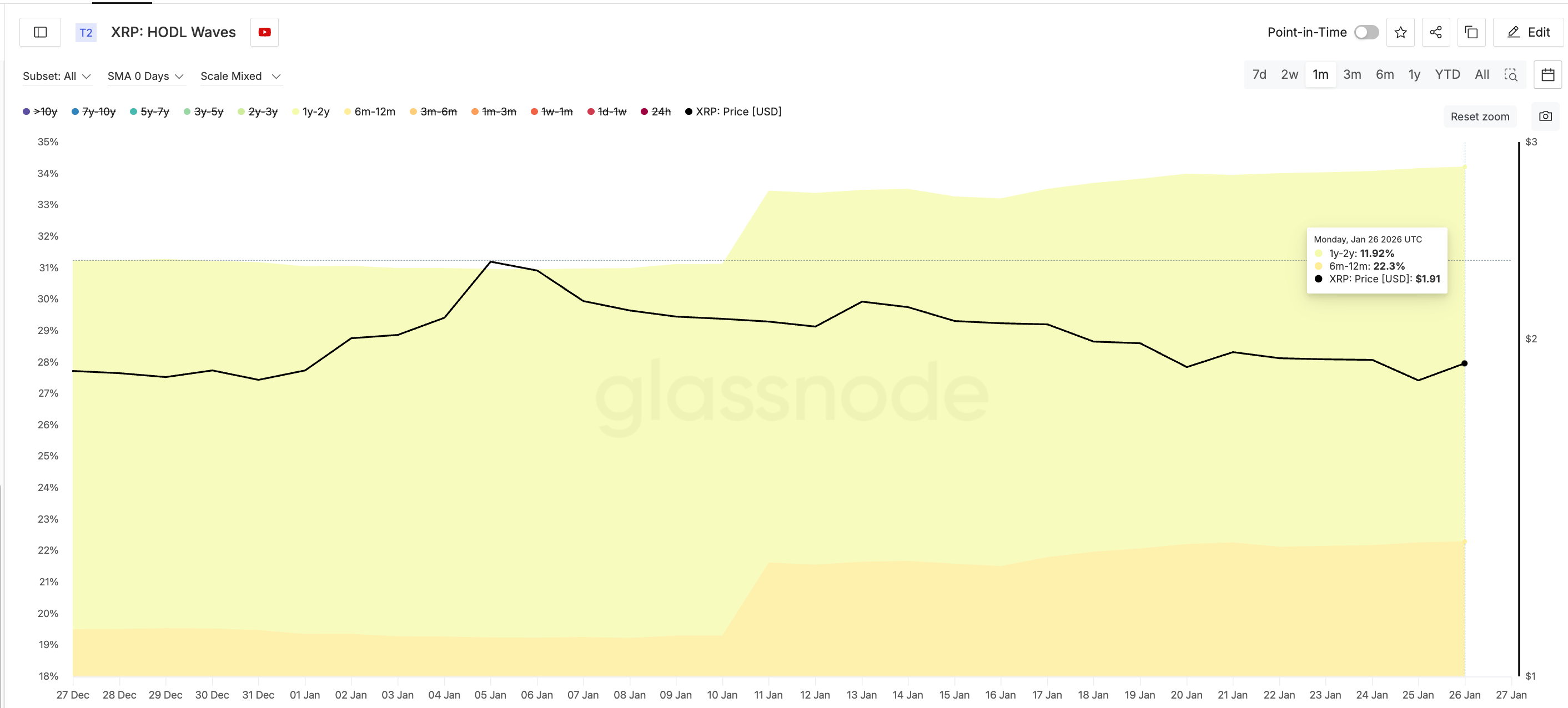 One of the clearest changes is visible in XRP’s HODL waves. The HODL Waves metric shows how long coins have been held, helping separate short-term traders from long-term conviction holders.